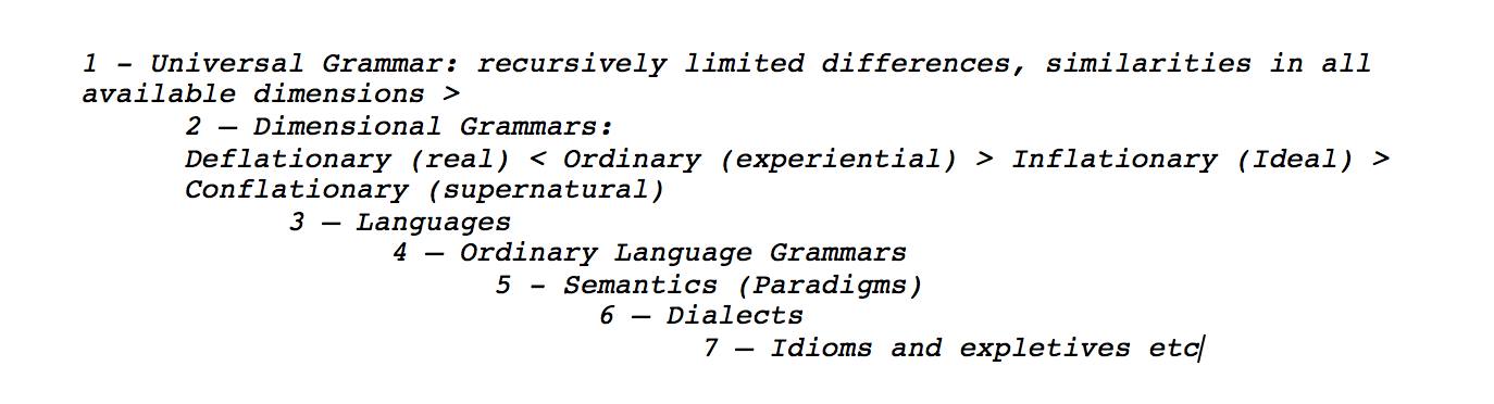 I was originally struggling because I was not separating the semantic (set of paradigms) in any langauge, from the dimensional grammars that can be constructed regardless of language, using different deflationary and inflationary grammars of universal grammar.