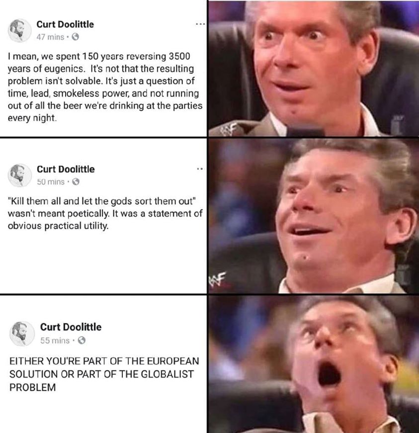 Слышу голос, он приказывает строго: БОГ СВОИХ УЗНАЕТ, УБИВАЙ ИХ ВСЕХ!”Oct 19, 2018, 6:10 PMMaxim V Filimonov(besides, I’m seeing a lot of people in your comments who seem to understand Russian a little. Is that a conspiracy, or is my language slowly becoming the redpill lingua franca?)Oct 19, 2018, 6:12 PMAaron BradleyIt’s the language of the only people of our kind who have freed themselves from the yoke of international financeOct 19, 2018, 6:13 PMMaxim V FilimonovThere is, I’m aware of that, but you can’t really say anything about my comment without the actual context.Oct 19, 2018, 6:13 PMMaxim V FilimonovAaron Bradley meh, we’re still fucked. However, we could overcome this, too.Oct 19, 2018, 6:14 PMCurt DoolittleThere is a russophillic component to conservativsm, yesOct 19, 2018, 6:15 PMAaron BradleyI wish we were simply “fucked” and not in a dystopian nightmare where death is courageous and pursuit of life an the natural order hateful.Oct 19, 2018, 6:15 PMMaxim V FilimonovKelly Hilton without the context, it’s “kinda fun”, but worthless nevertheless, sorryOct 19, 2018, 6:16 PMMaxim V FilimonovAaron Bradley meh, we also have that shit. As if that was the first time we were that fucked.Oct 19, 2018, 6:16 PMDmitry NikolovI was gonna make a meme like this with your “going full fash” postOct 19, 2018, 6:16 PMCurt Doolittleooh… smart. That would be good…. hmm…Oct 19, 2018, 6:17 PMDmitry NikolovThis should do for now 😁Oct 19, 2018, 6:21 PMMaxim V FilimonovKelly Hilton I mean, it’s a modified quote from a movie. Without knowing the context, it’s “meh”.