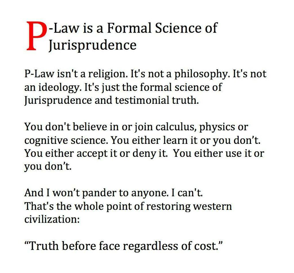 P isn’t a religion. It’s not a philosophy. It’s not an ideology. It’s just the formal science of jurisprudence, and in particular of testimonial truth. You don’t ‘join’ physics or ‘calculus’ or ‘cognitive science’. You either accept it or deny it.