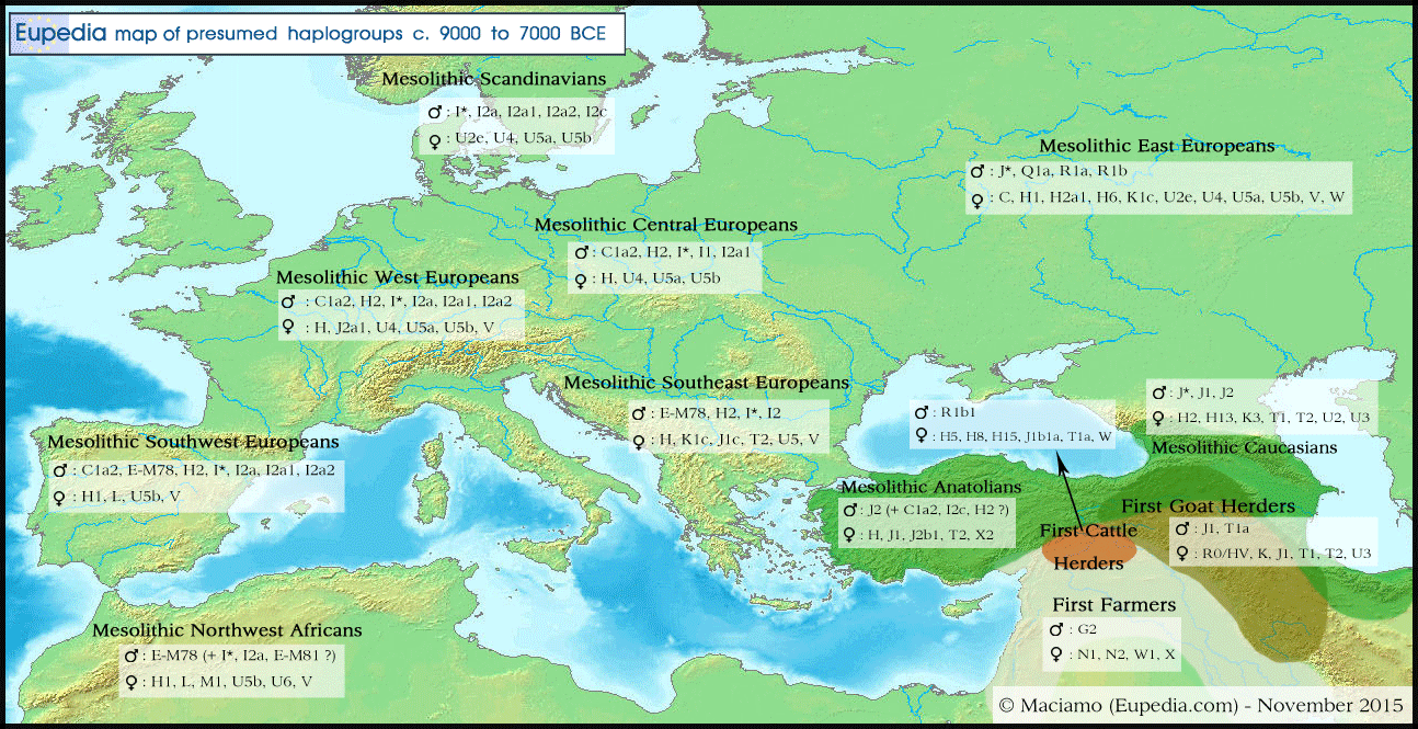 European Hunter Gatherers Repopulate Europe: European hunter-gatherers (EHG) survived the Ice Age in pockets of the warmer Mediterranean climate, in today’s Spain, Italy, and either the Balkans or Greece. As the climate warmed, they followed the retreating ice north, and recolonized Europe, resulting in three groups distinct groups: Western (WHG), Scandinavia(SHG), and Eastern (EHG) european hunter-gatherers. WHGs inhabited an area stretching from the British Isles in the west to the Carpathians in the east