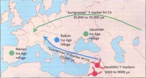 The analyses suggested that 70-80% of their ancestry evolved from the Aurignacian culture of about 35,000 BP, from the Goyet Caves in modern Belgium. And that these people didn’t settle in europe but followed herds.