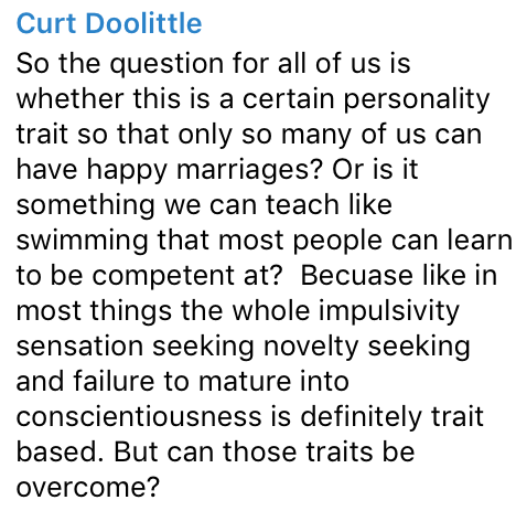 So, is a happy marriage in modernity almost always going to result from genetic predisposition? Or if not, can we train people to be happy in a marriage,(and in mindfulness, and fitness, and basic family management)? https://t.co/u4EOE2zuEU