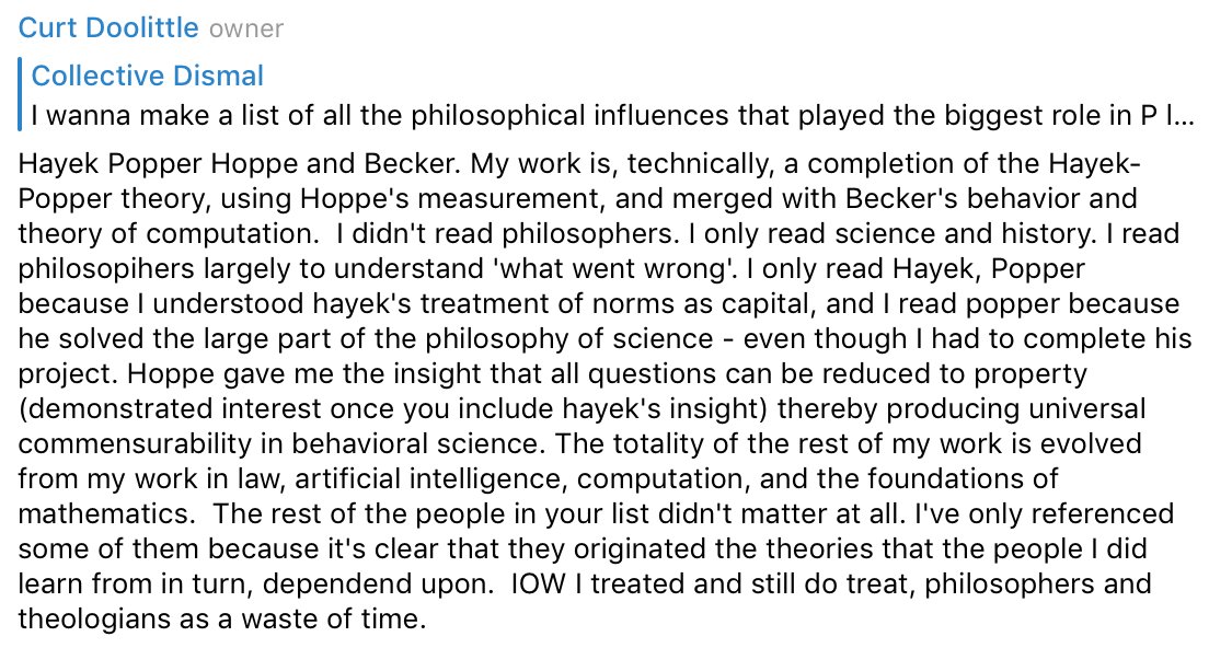 I read thinkers in nearly every field, simply because I address the problems of every field. That’s different from asking who influenced me. That list is quite small: Hayek, Popper, Becker, Hoppe, Quigley. The rest is the result of work in mathematics, computation, AI, and law. https://t.co/mRjsD0kFvh