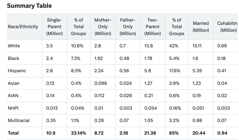 There are about 10.9 million single-parent family groups with children under 18 – about a third: 33.14%