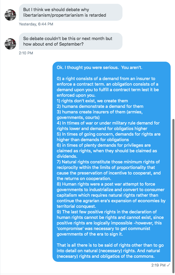 There is no reason to do debate in person unless there is evidence one is worthy of debate. So far I don’t hear any argument worth having that hasn’t been settled by the evidence. I you can’t make an argument in text you sure as heck can’t make one in words.
