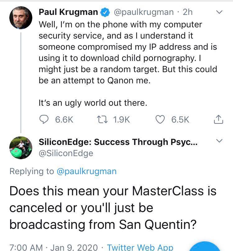 Background: Someone is downloading ch–d p-rn-graphy using Krugman’s ip address (a fairly easy hacker thing to do, and especially if they can get some malicious code on his machine via email.)