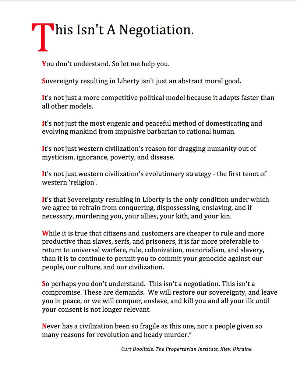 Sovereignty. Rule of Natural Judge Discovered, Common Law. Direct Democracy over a Market Commons with Houses for the Classes. Direct redistribution of proceeds from the commons, and liquidity from the treasury to the citizenry. An end to Fiat Credit Capitalism, an end to Politicians, and an end to propaganda, misrepresentation, pseudoscience, and deceit in the informational commons (public discourse). And the creation of opportunities in every state by the decentralization of power, and the devolution of the federal government to regions.