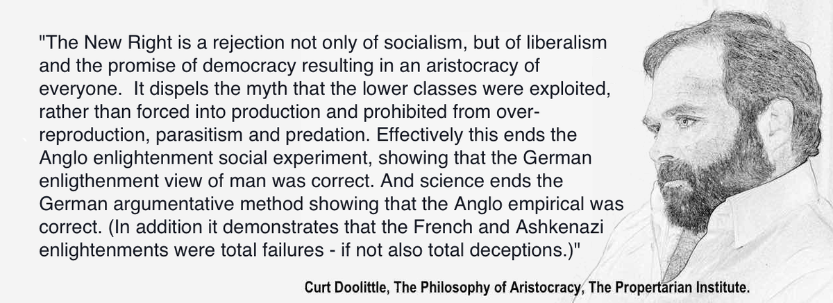 [N]ot that I mean to act as a critic, or to draw attention away from your excellent post, but you might need to add the third point in the first position. THE FAILURE OF THE UTOPIAN CATHEDRAL’S RELIGION First and foremost it is a criticism of the Cathedral Complex: Academy, State and Media, and the use of propaganda to perpetuate detrimental falsehoods. I would argue that the criticism of the Cathedral Complex as a False Promise using deceit, pseudoscience, and propaganda, is the first principle of Neo-Reaction, and the most effective content in the neo-reactionary movement. NEOCAMERALISM NeoCameralism I agree with. The state is a corporation acting in the interests of its management and staff at the expense of the customers long term interest, by the constant sale of territorial, physical, cultural, and normative capital in exchange for short term consumption (r-selection). The problem is, how do we construct commons: territorial, physical, cultural, and normative while at the same time, eliminating the privatization of those commons that is the means by which the Academy, State, Media complex sustains and expands itself? FORMALISM Formalism attempts but fails to capture what one intuits in its use, which is why I’ve restated it in greater depth as a complete philosophical system It is the failure of formalism (because the author is a hermeneuticist of the cosmopolitan jewish tradition) that prevents neo-reaction from institutional actionability. Unless expressible as law (the anglo analytic and empirical tradition) it must be propagated as religion using the same propaganda mechanisms that the cathedral complex relied upon, but without possessing either the assets of distribution or equalling the incentives that the cathedral promises. This is non-logical. THE CRITICISM INFORMS US In propertarianism and testimonialism I have created a formal system of thought that unifies biology, psychology, morality, sociology, philosophy, law, economics, and war into a formal logic (Formalism). Propertarianism inverts democracy to a market for commons between the classes, not dependent upon assent, but upon dissent: survival under universal standing under law. (prohibition on parasitic outcomes). A law which is made possible by the formal unification of the fields. Small changes in the law – the constitution upon which laws are constructed – make a reactionary program possible. But in this case, it is not reactionary, but revolutionary – not restitution but reformation. Curt Doolittle The Propertarian Institute Kiev, Ukraine.